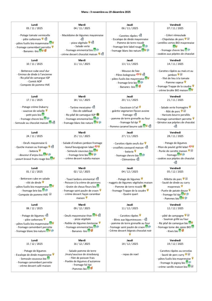 Voici les menus de la cantine du 03 novembre au 19 décembre 2025.