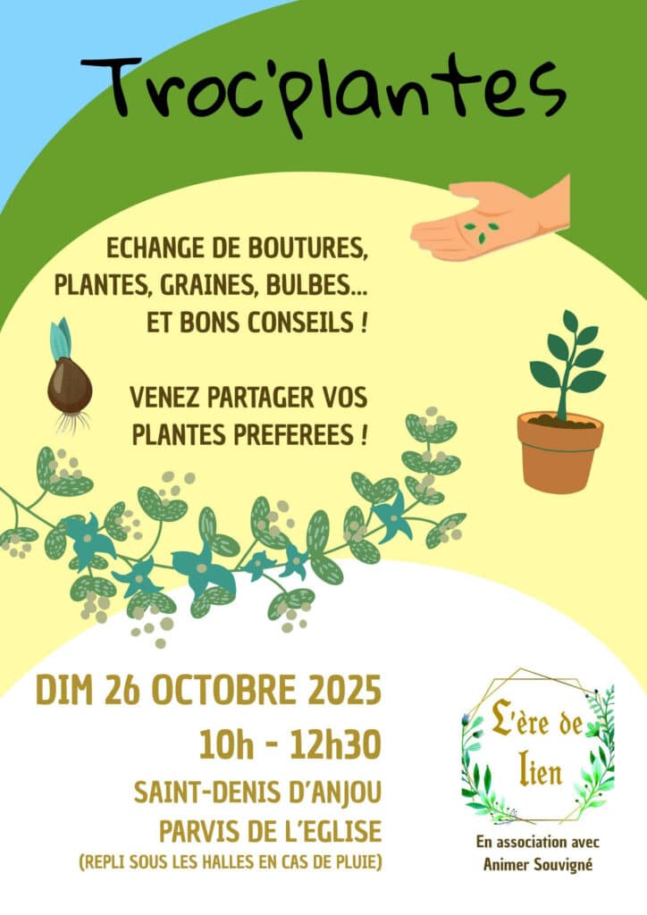 TROC- PLANTES, le dimanche 26 octobre de 10h à 12h30 sur le parvis de l’église, à Saint Denis d’Anjou.