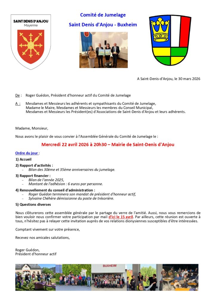Après avoir fêté le 35ème anniversaire de son jumelage avec Buxheim (Bavière) en 2024 puis en 2025, le Comité de Jumelage de Saint-Denis-d’Anjou invite les Dionysiens et Dionysiennes le mercredi 22 avril 2026 à 20h30 à la Mairie pour son Assemblée Générale qui se clôturera par un pot de l’amitié.