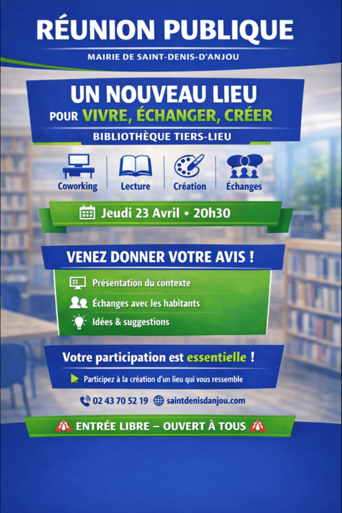 Le jeudi 23 avril à 20h30 à la Mairie de Saint-Denis-d’Anjou.