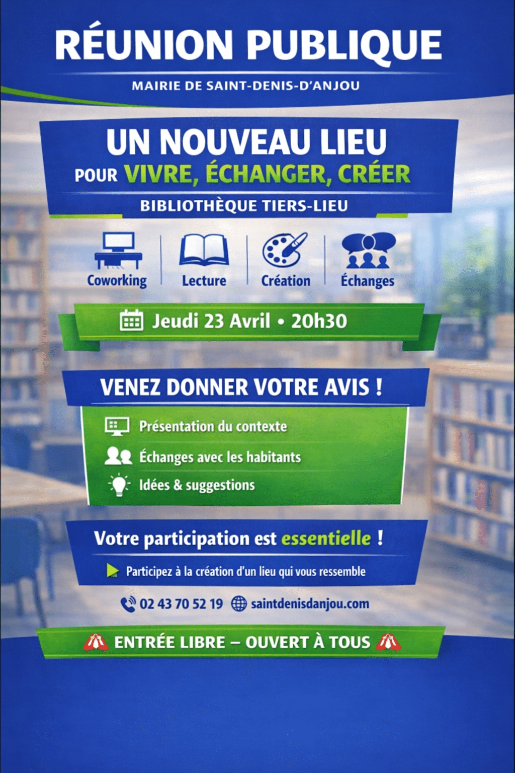 Réunion publique : un nouveau lieu pour vivre, échanger, créer bibliothèque tiers-lieu. Le jeudi 23 avril à 20h30 à la Mairie de Saint-Denis-d’Anjou. Venez donner