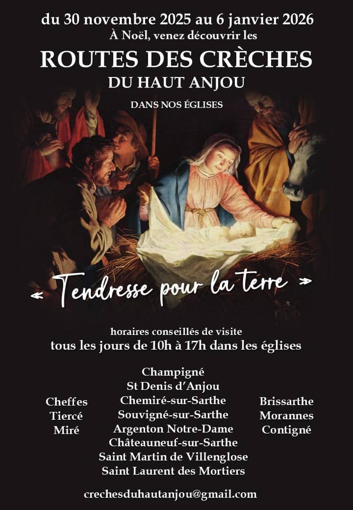 Du 30 novembre 202 au 06 Janvier 2026. Tous les jours de 10h à 17h. Églises ouvertes : Cheffes, Tiercé, Miré, Champigné, Saint-Denis-d’Anjou, Chemiré-sur-Sarthe, Souvigné-sur-Sarthe,