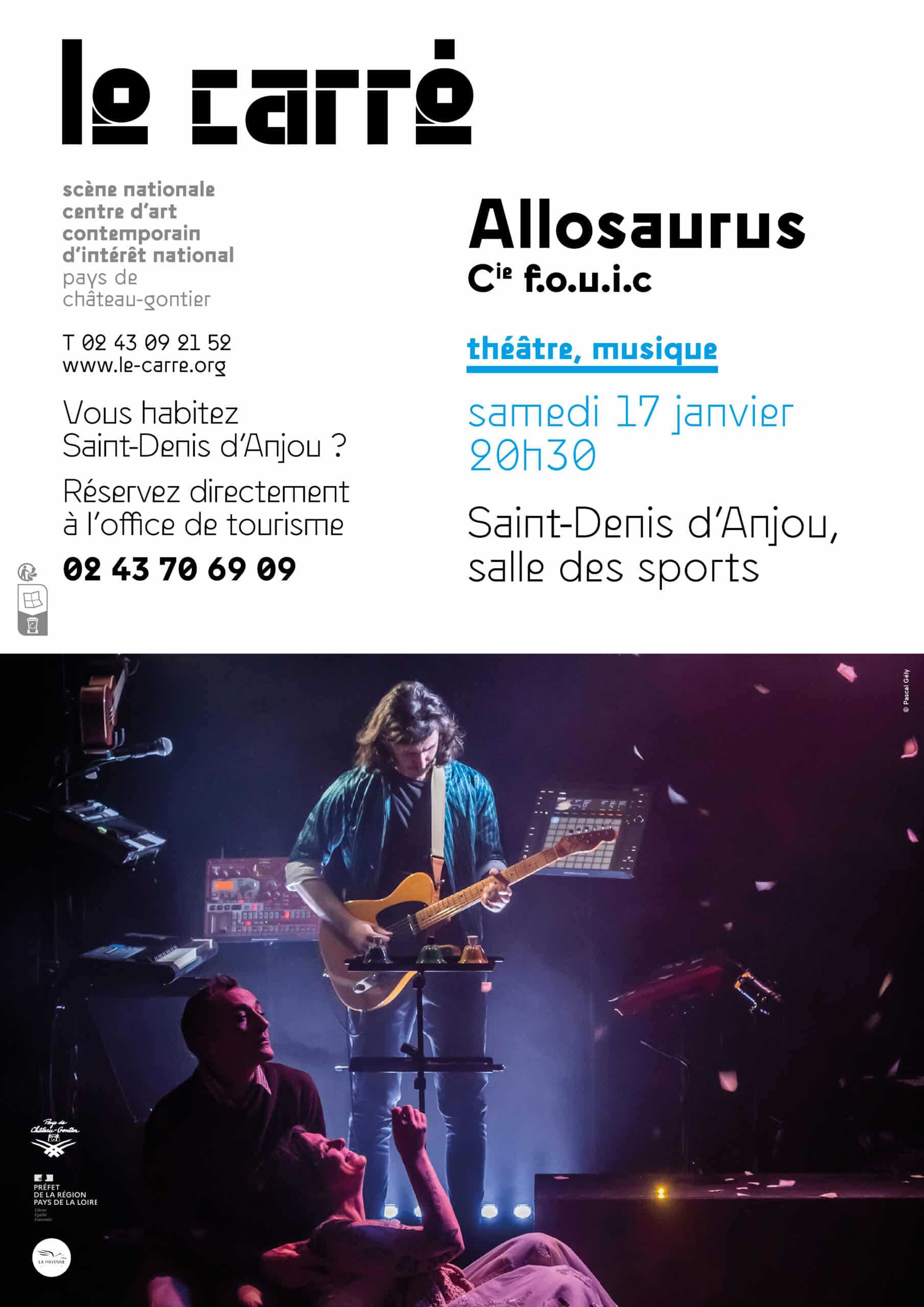 Le samedi 17 janvier à 20h30 à la salle des sports de Saint-Denis-d’Anjou, venez assister à la pièce de théâtre Allosaurus, compagnie f.o.u.i.c. Vous pouvez